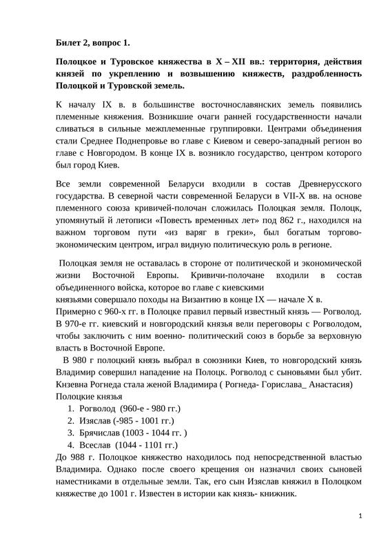 Билет 2. Вопрос 1. Полоцкое и Туровское княжества в X – XII вв.: